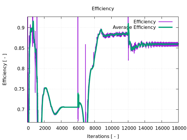 インタフェース:mixingInterface(ラジアル平均) 乱流モデル:k-ωSST メッシュ:外部ヘキサメッシュ メッシュセル(セグメント):210580 メッシュ平均y +:100 [-] CPU時間(セグメント):8 [core.hours] |